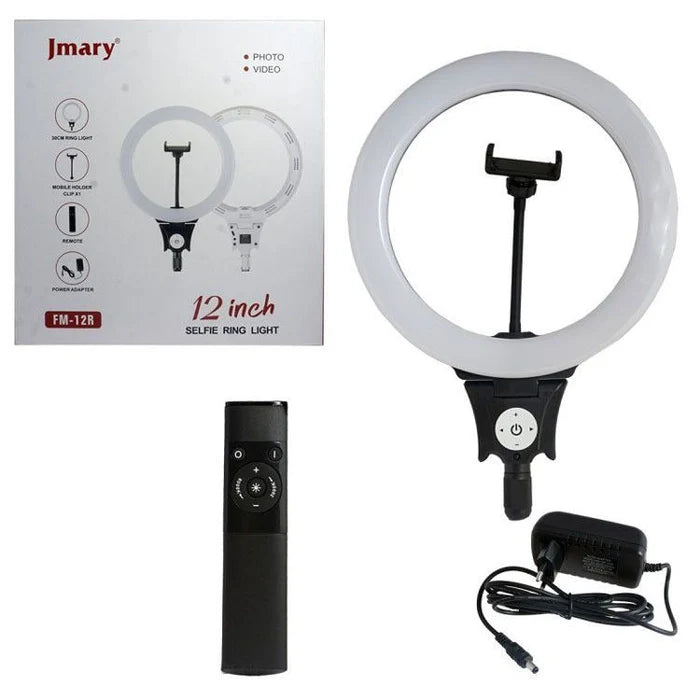 The JMARY Ring Light FM-12R provides optimal lighting for photography, live streaming, and videos. Its adjustable design with multiple brightness settings ensures perfect lighting, suitable for home or studio use.