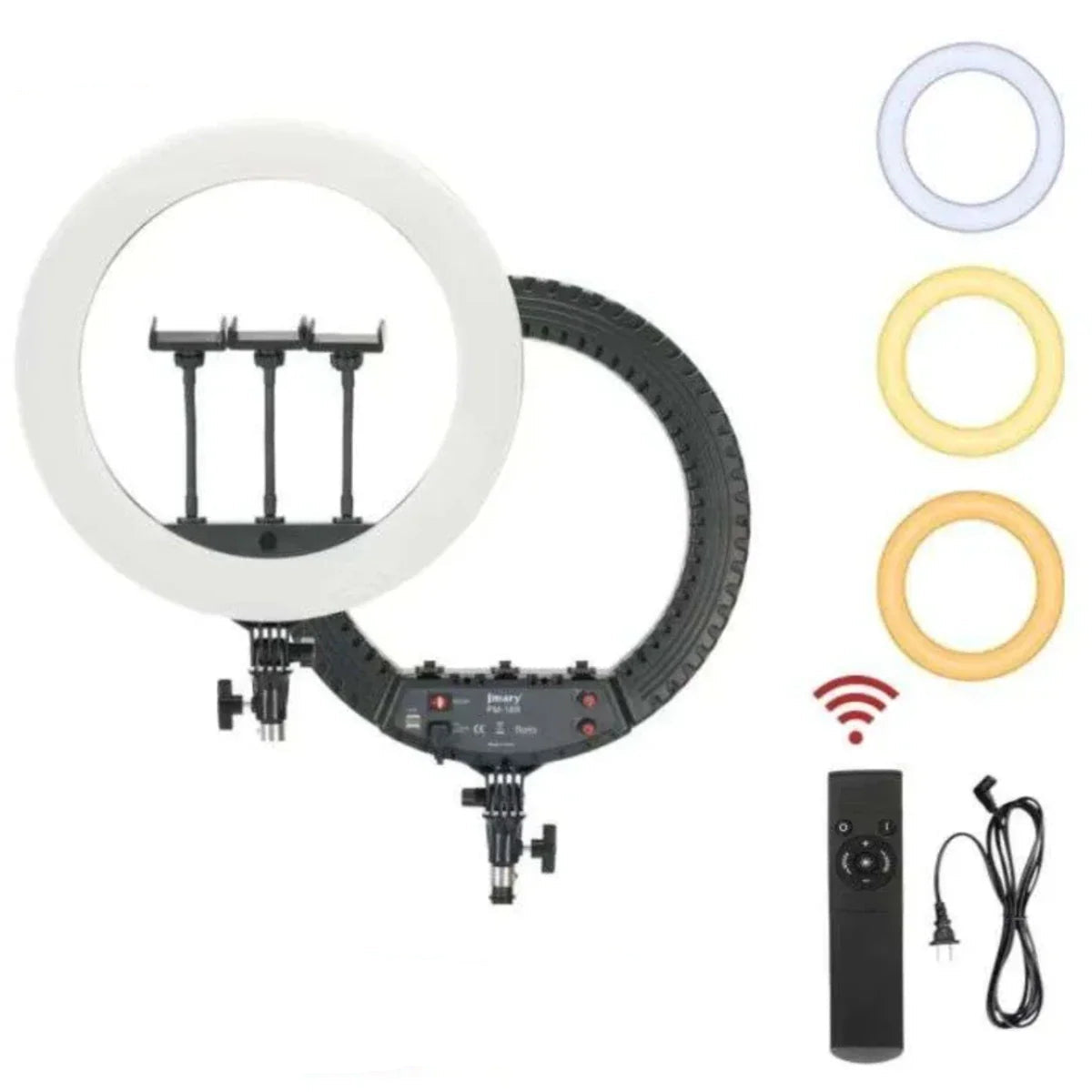 The JMARY Ring Light FM-18R provides powerful and balanced lighting for photography, live streaming, and videos. Its adjustable design with multiple brightness settings ensures perfect lighting, ideal for home or studio use.